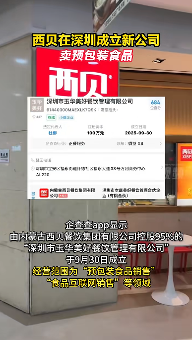 据南方日报报道,企查查app显示,由内蒙古西贝餐饮集团有限公司(下称“西贝餐饮”)控股95%的“深圳市玉华美好餐饮管理有限公司”于9月30日成立,经营范围为“预包装食品销售”“食品互联网销售”等领域。